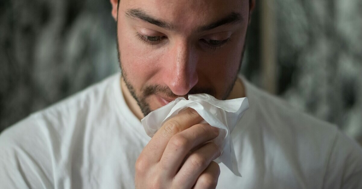Person mit Schnupfen hält ein Taschentuch vor die Nase